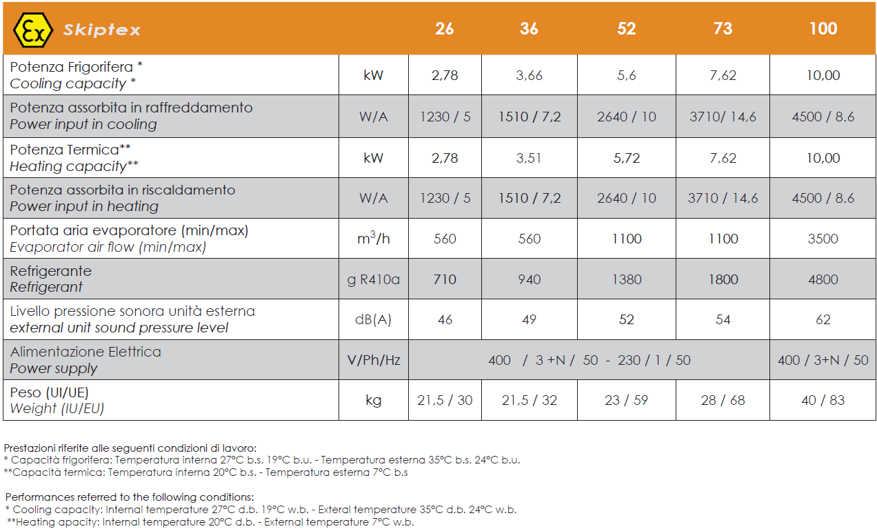 Unità interna ealizzata con componentistica certificata ATEX classe II T3 e disponibile in pompa di calore, con diffusore semplice o a doppia mandata eventualmente canalizzabile, Skiptex è un ottima soluzione per il condizionamento e il riscaldamento, eventualmente implementabile con un sistema di telecontrollo e telegestione.